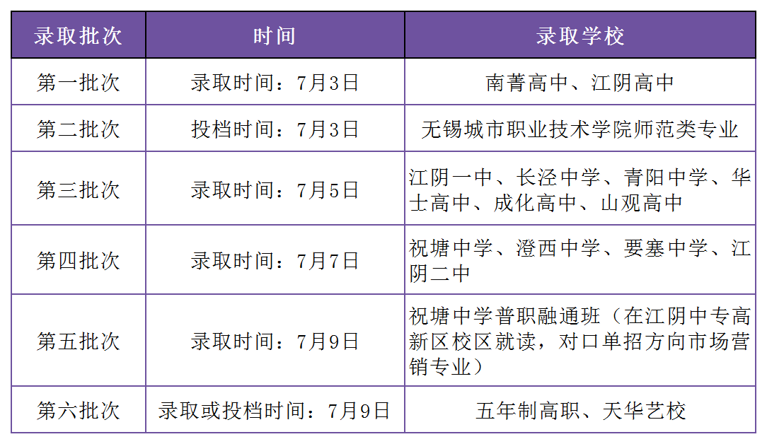 江阴市2021年中考志愿填报时间是在:6月30日至7月2日,各批次录取学校如下图: