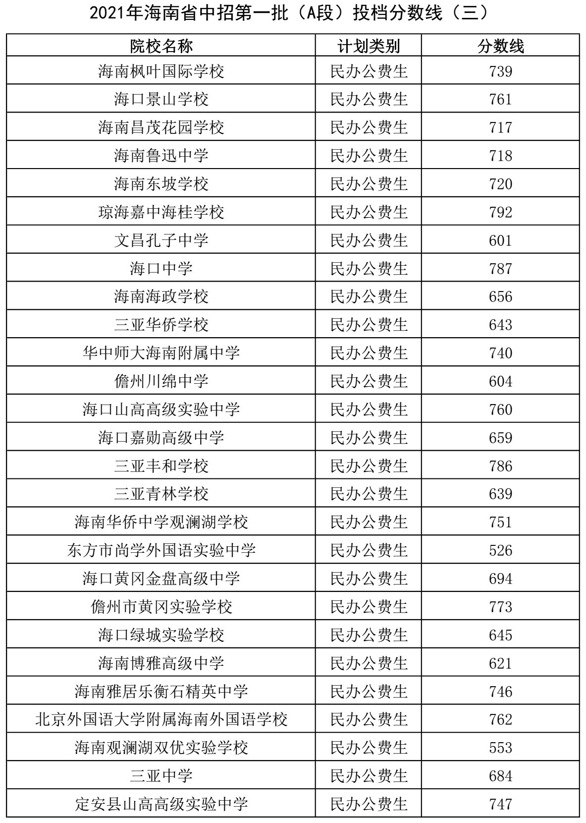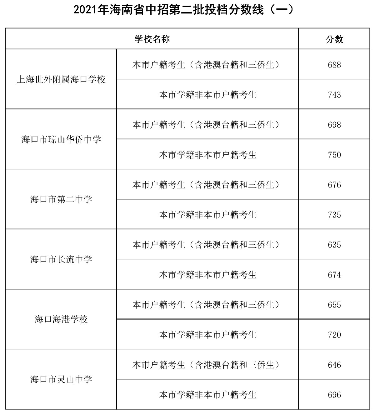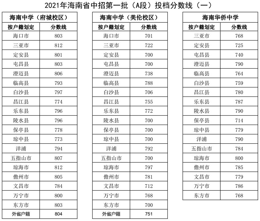 海南省中招第一批(A段)投档分数线