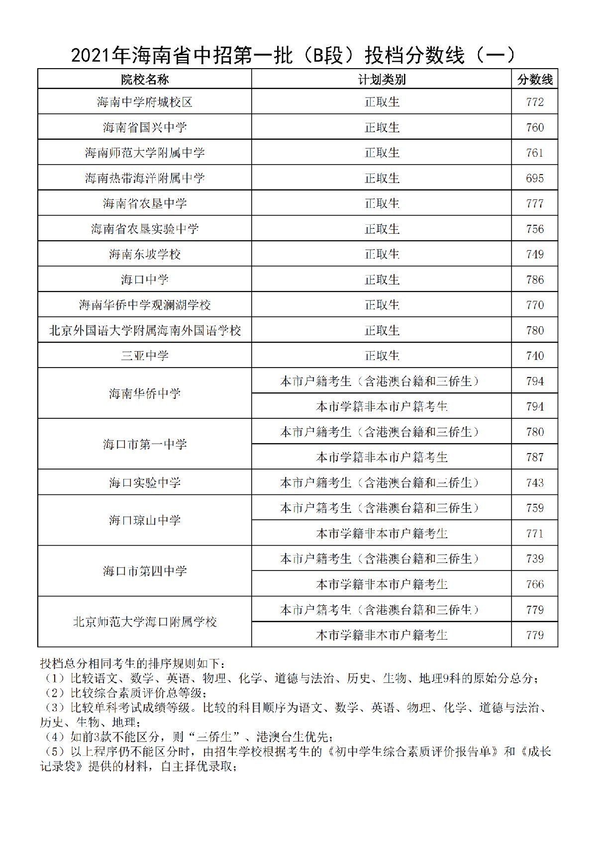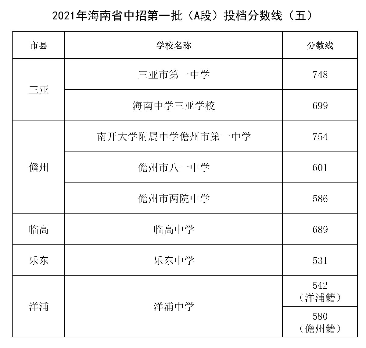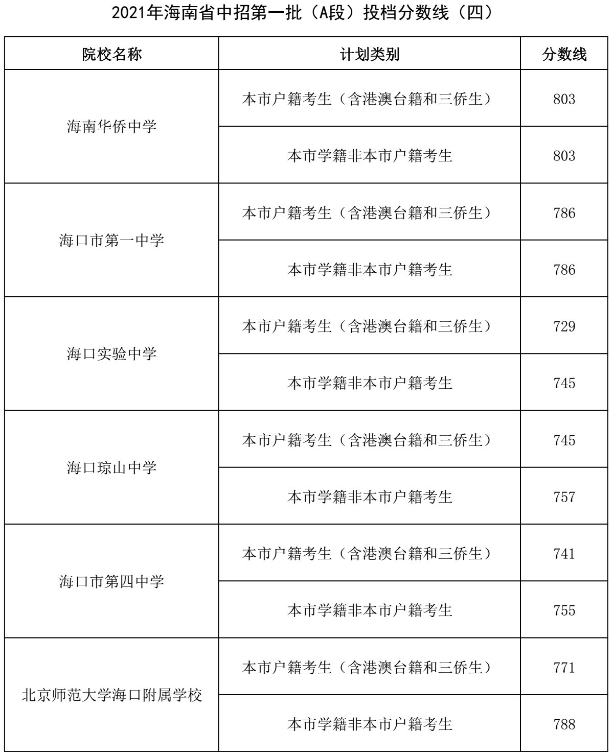 海南省中招第一批(A段)投档分数线