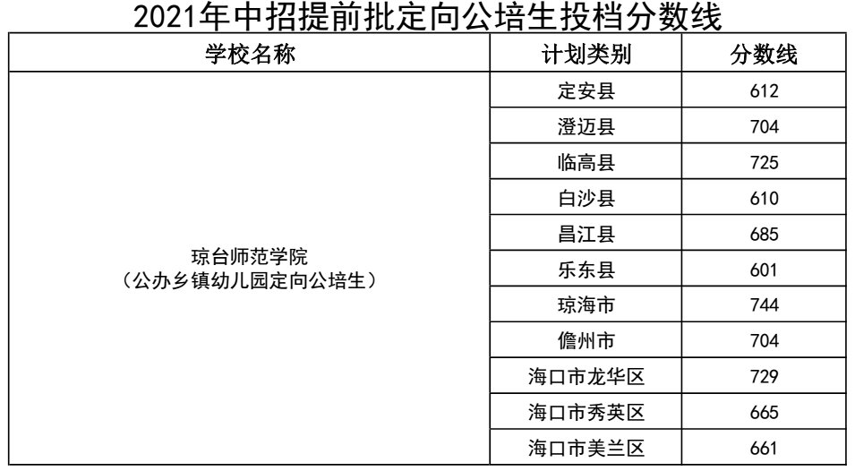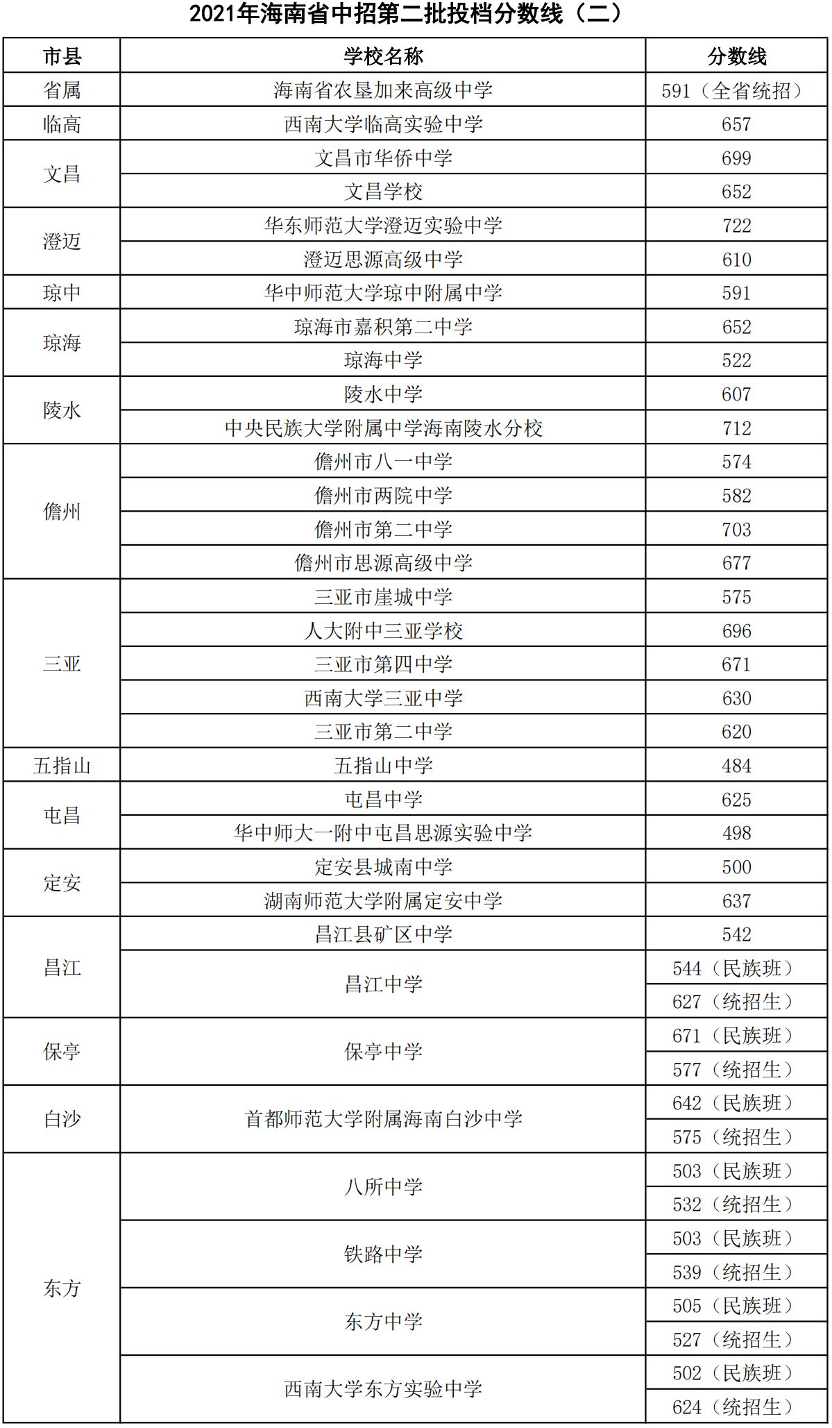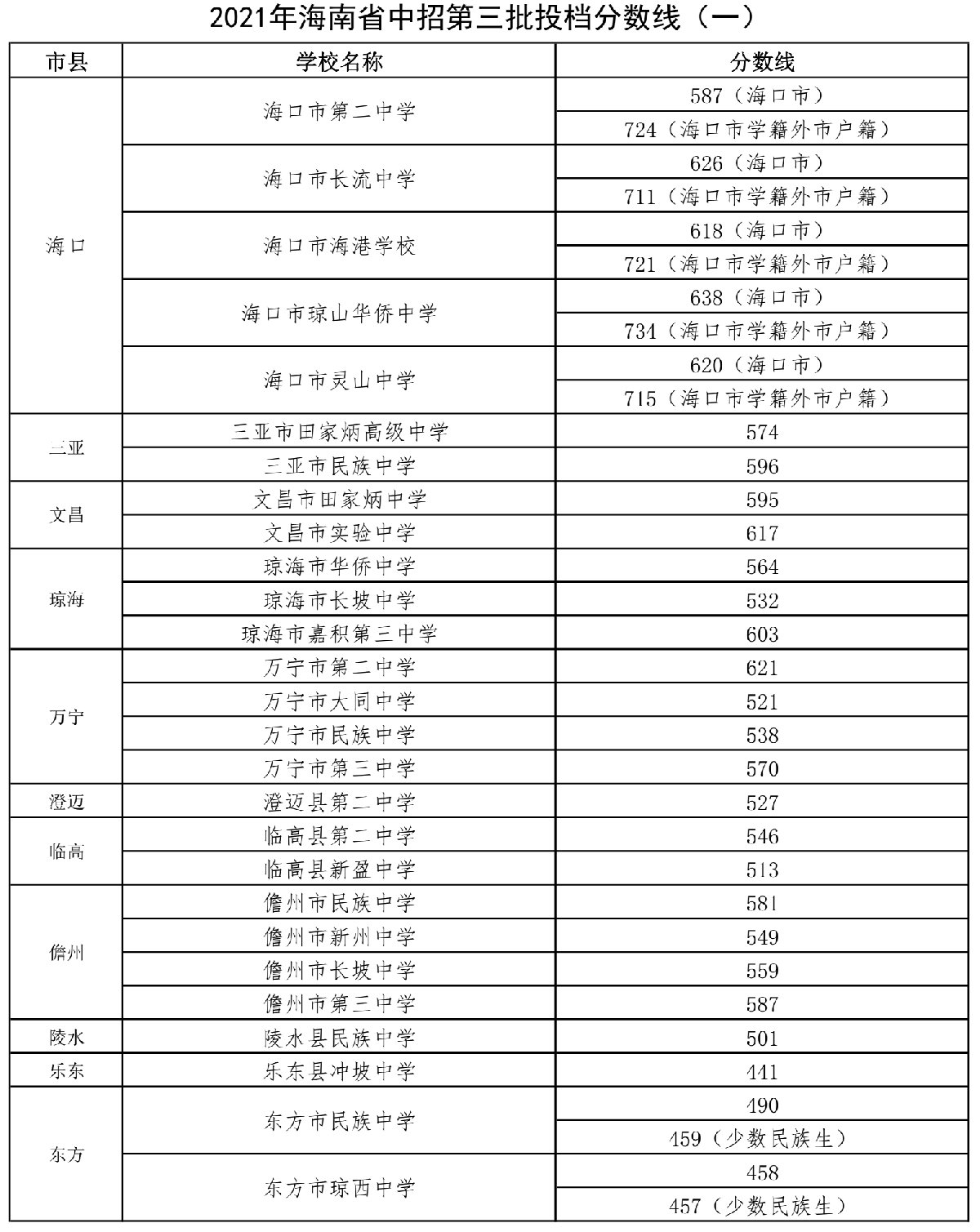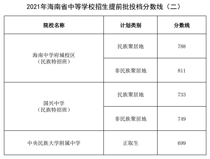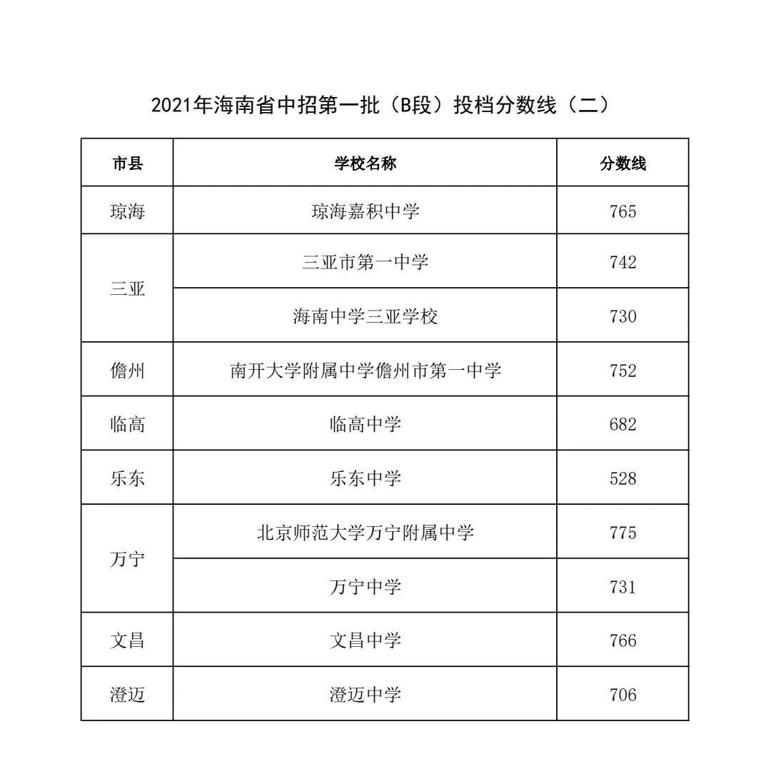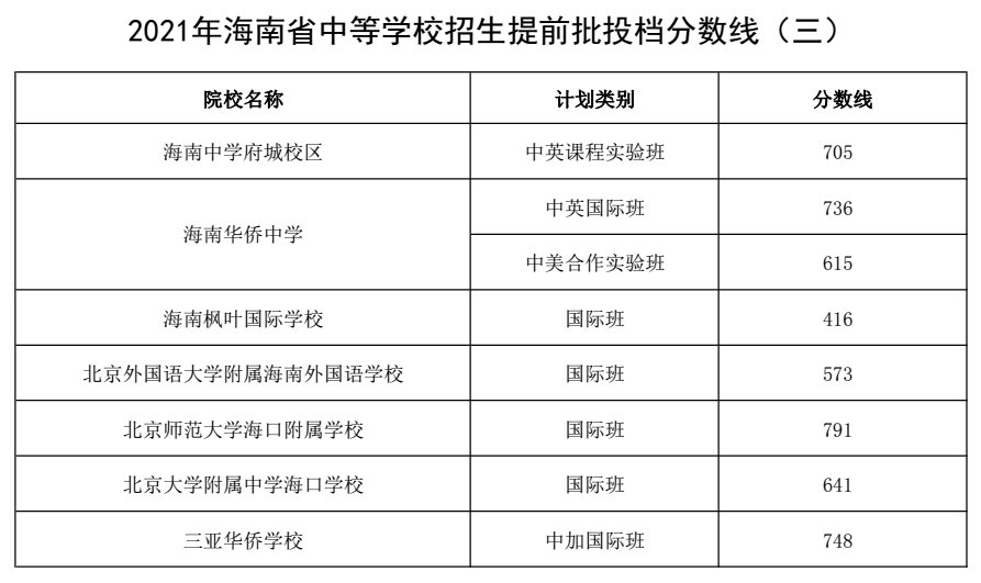 2021年海南省普通高中学校录取最低控制分数线