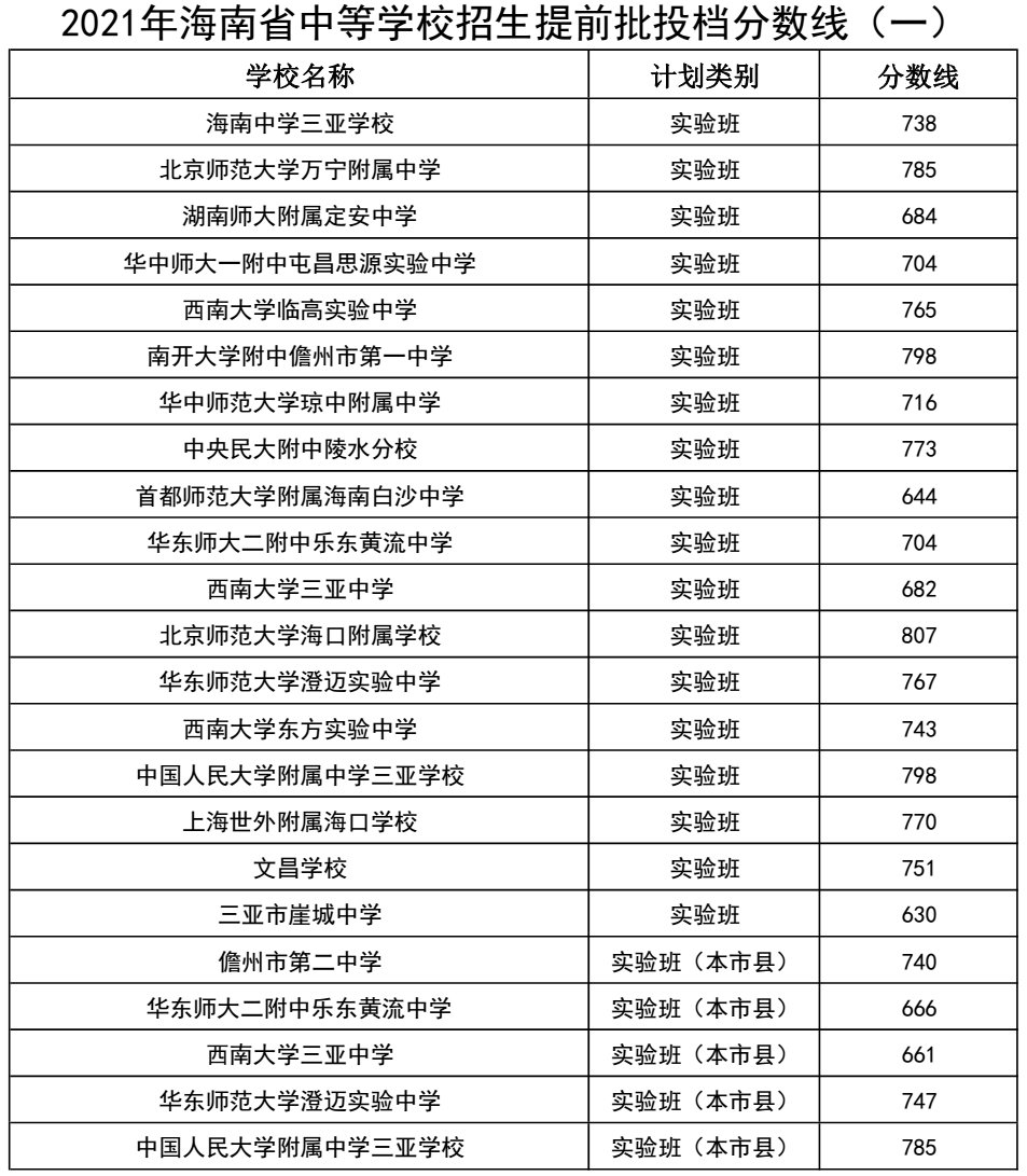 1、海南省中等学校招生提前批投档分数线(一)